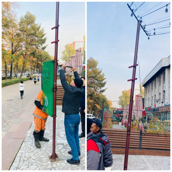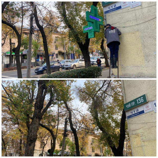- В Первомайском районе по проспекту Чуй от проспекта Манаса до улицы Тоголок Молдо. Демонтировано: 44 - баннера, 16 - штендеров, 6 - указателей (лайтбоксы), 2 - железных ограждения, 1 - силомер.