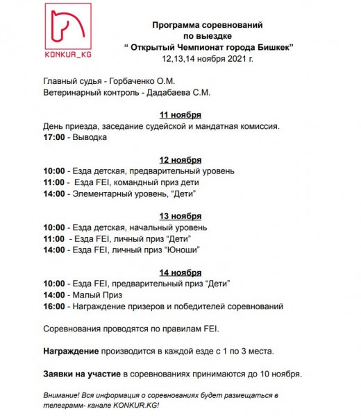 12, 13 и 14 ноября в СДЮШОР «Күлүк» по адресу: ул. Елебесова №204а состоится открытый Чемпионат города Бишкек по конному спорту (выездка) среди детей, молодежи и взрослых.