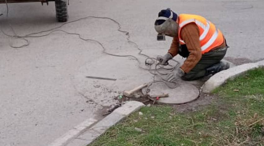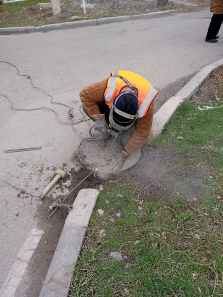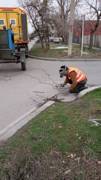 Бригада службы водоснабжения ПЭУ «Бишкекводоканал» установила железную крышку колодца. Крышка приварена, так как зачастую их воруют.