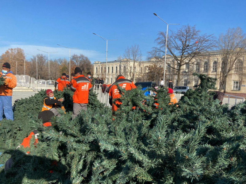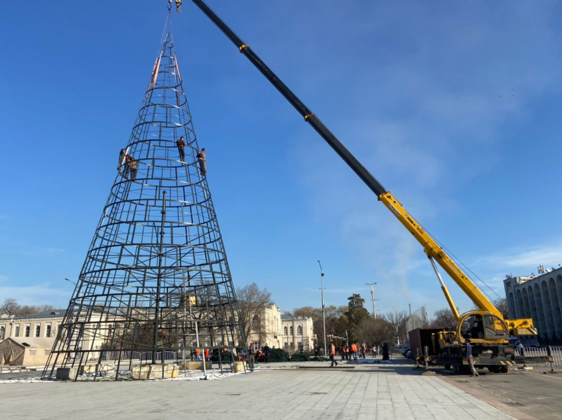 Прямо сейчас бригада Тазалыка почти завершила сбор каркаса конструкции главной елки страны, далее начнет закреплять 1 тысячу 400 еловых веток. Отметим, что высота елки 25 метров, а диаметр основания – 12 метров.