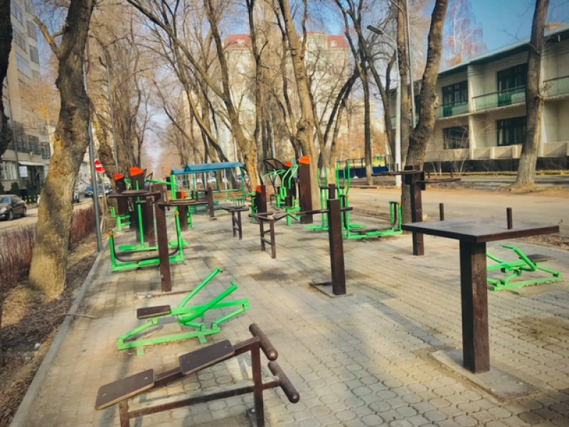 В сквере установлены скамейки, беседки, множество турников и спортивных тренажеров, а по периметру высажена живая изгородь.