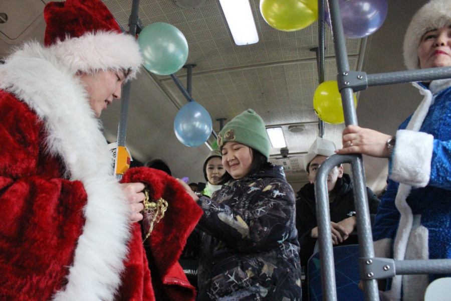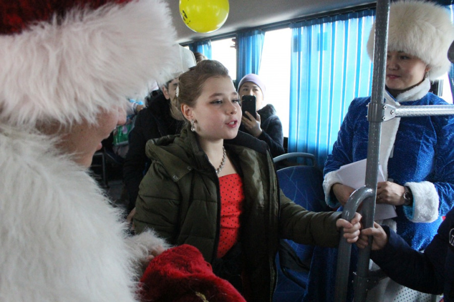Накануне пассажиров в автобусе №7 поздравляли Дед Мороз и Снегурочка.