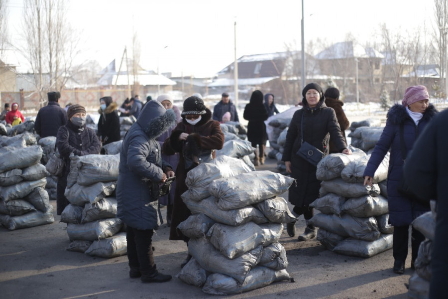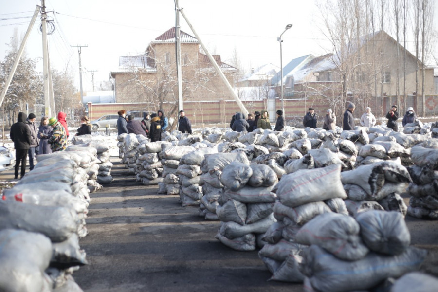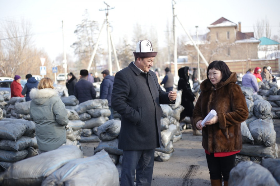По 10 мешков угля получили 150 нуждающихся семей, глава района Жамалбек Ырсалиев также принял участие в раздаче твердого топлива.