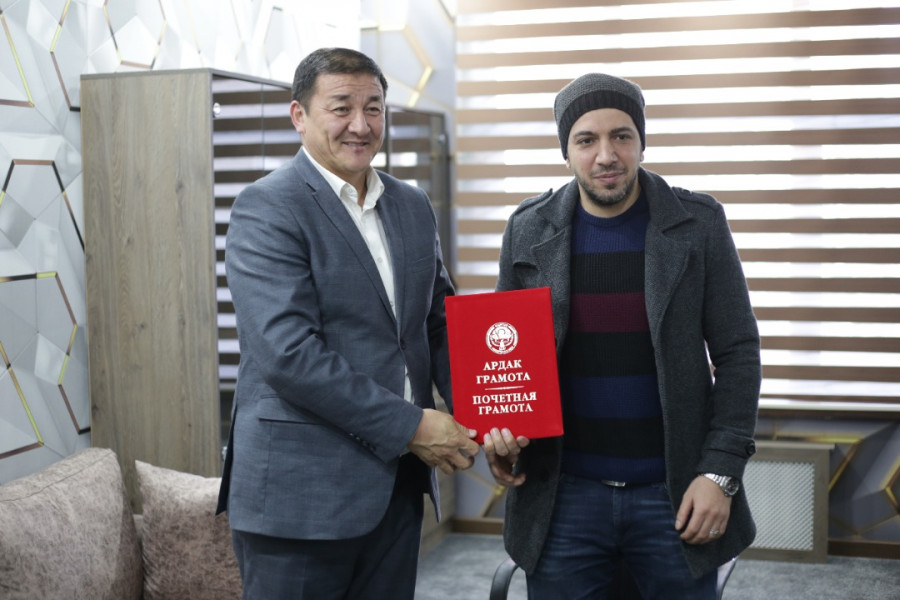 Также, Ж.Ырсалиев поблагодарил за постоянную поддержку, оказываемую Фондом по благотворительным, гуманитарным проектам и вручил почетные грамоты президенту Фонда Бакыт Сарыбай уулу, менеджеру Шариф Аль Аюби.