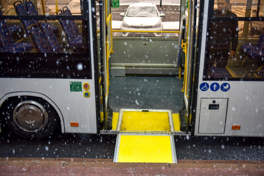 Который влючает в себя откидной трап для заезда инвалидной коляски с ручкой, систему наклона кузова "Книлинг" для облегчения посадки/высадки пассажиров; оборудование для крепления соответствующего устройства для ЛОВЗ.