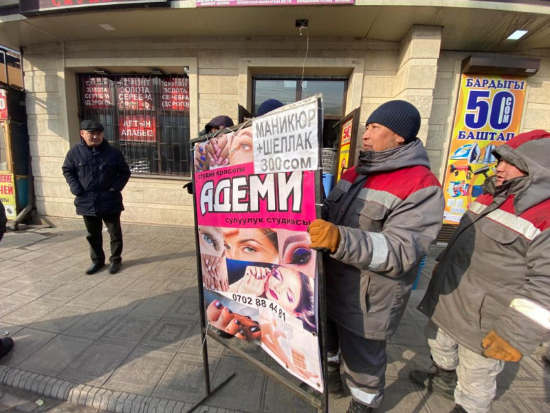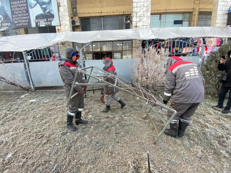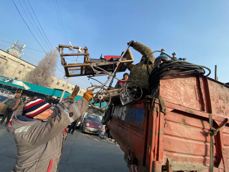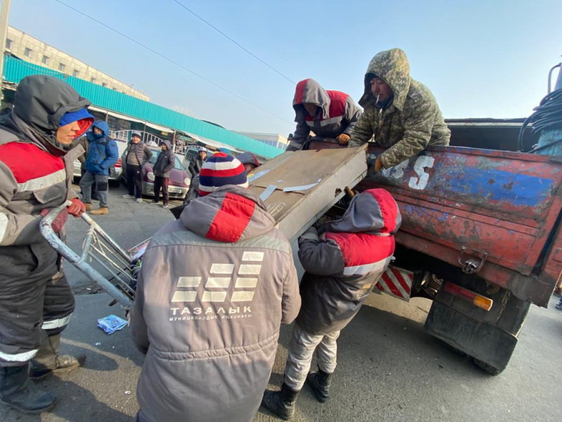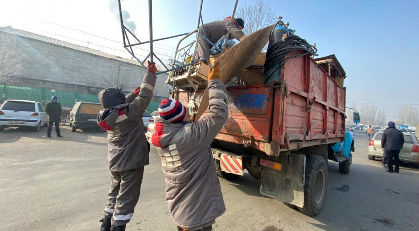 Муниципальная инспекция по контролю за благоустройством и землепользованием мэрии города Бишкек совместно с муниципальной администрацией по Ленинскому району проводит рейдовые мероприятия на территории Ошского рынка.