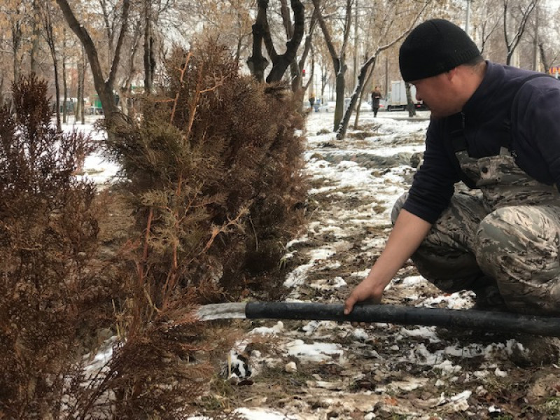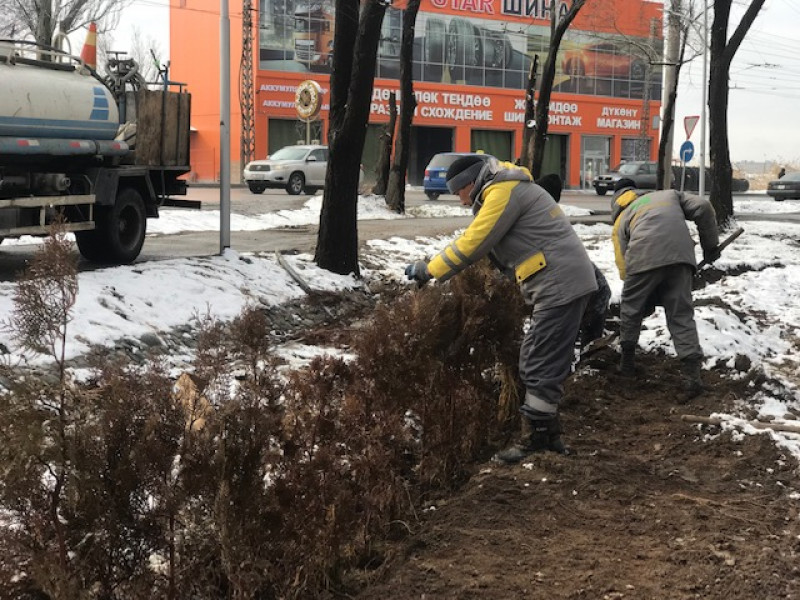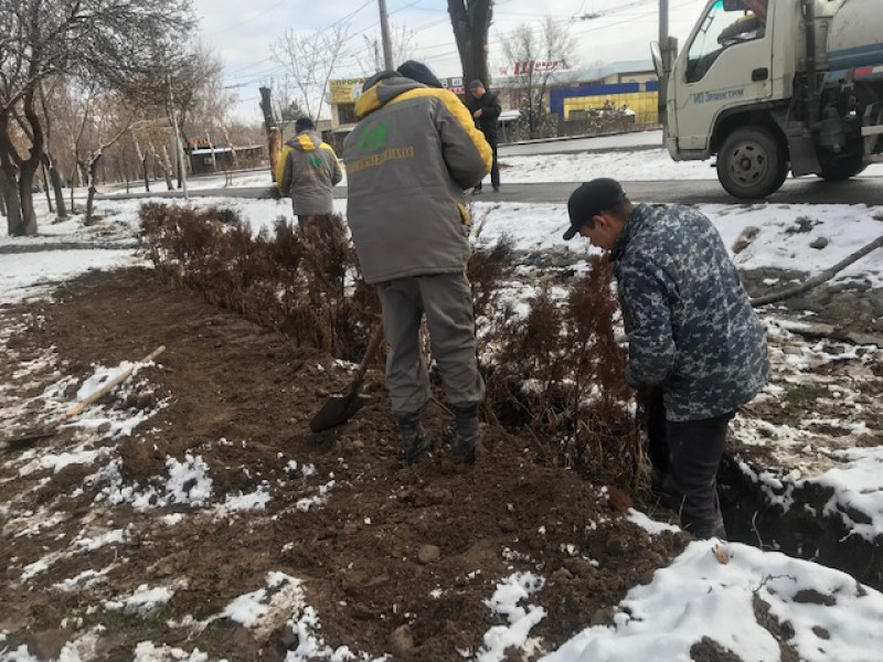 Сотрудники муниципального предприятия «Бишкекзеленхоз» продолжают зимние посадки хвойных деревьев.