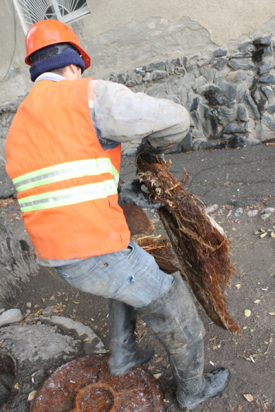 Для того, чтобы очистить от засора аварийный участок специалисты водоканала работают вручную. Стоит понимать, что многокилограммовые «пробки», спрессованные из множества тряпок, остатков от приготовления пищи, средств личной гигиены и полиэтиленовых пакетов не проталкиваются, а высвобождаются вручную специальными тросами.
