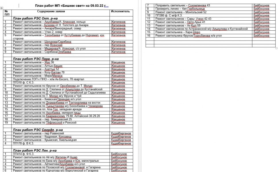 Как сообщают в муниципальном предприятии «Бишкексвет», 10 марта на городских улицах столицы ведутся ремонтно-восстановительные работы сетей наружного освещения.