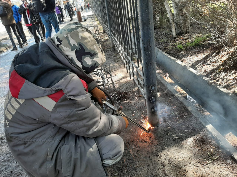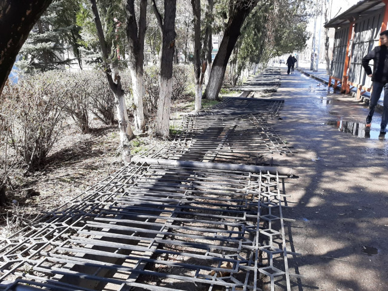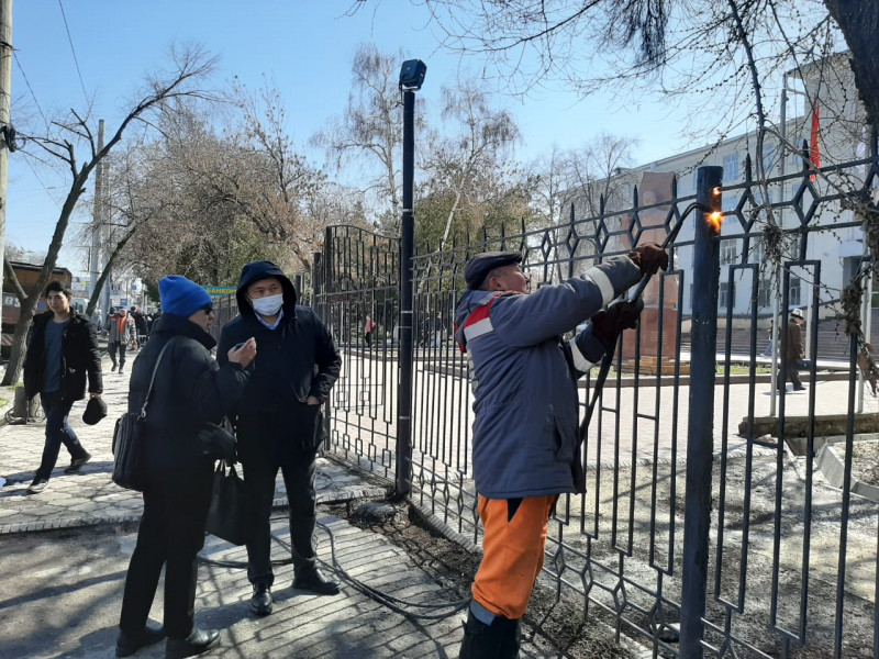 В это же время КГУСТА им. Н.Исанова по улице Малдыбаева 34 б после уведомлений в добровольном порядке убирают ограждения. Их заборы останутся у них.