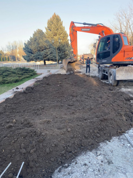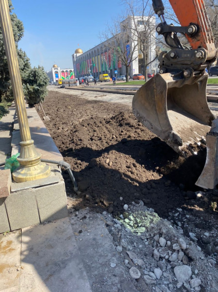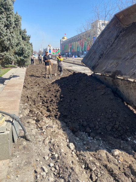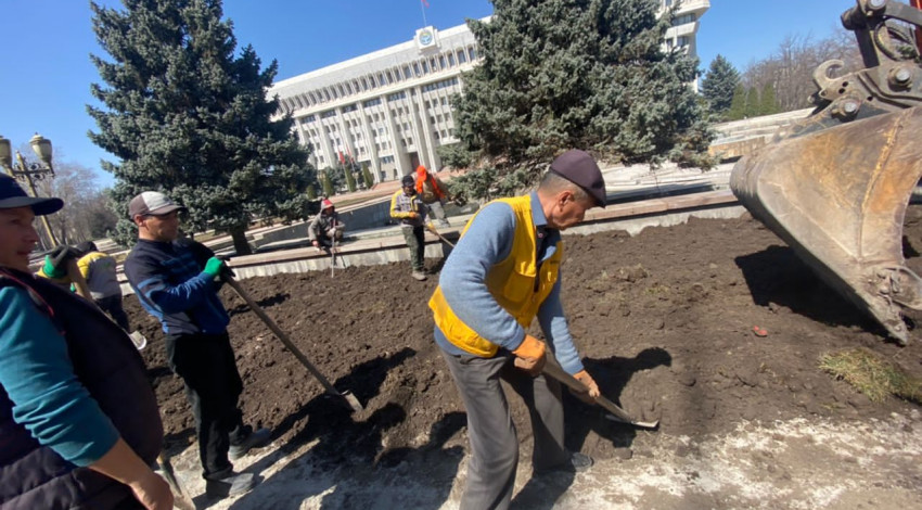 Совсем недавно сотрудники муниципального предприятия «Тазалык» демонтировали фундамент забора с южной стороны Белого дома. А сейчас сотрудники муниципального предприятия «Бишкекзеленхоз» разравнивают грунт, подключают поливочный водопровод и буду устраивать газон с дальнейшим озеленением.