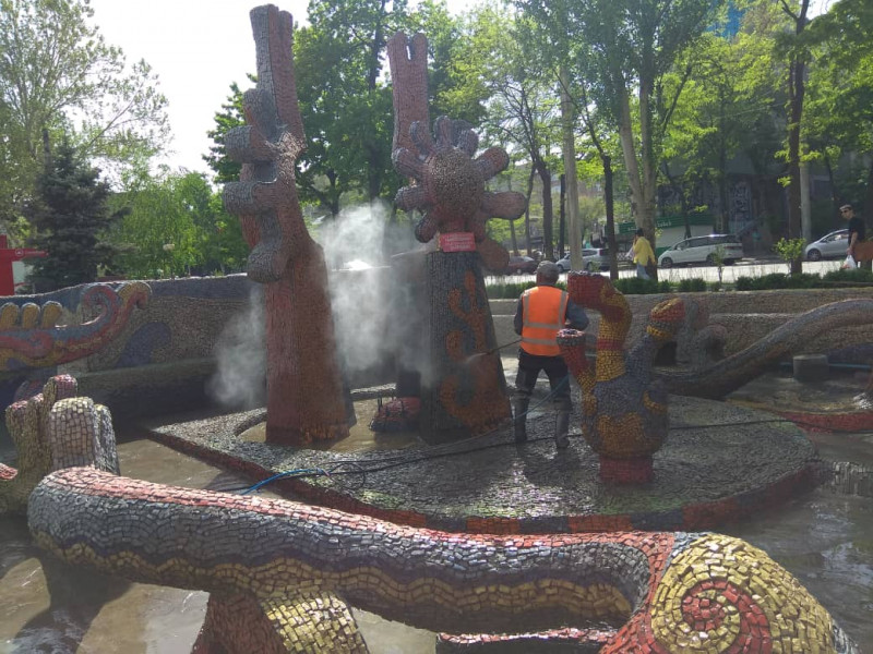 Также продолжается мойка фонтана «Солнечные рыбки» по улице Абдрахманова. В скором времени сотрудники городской службы приступят к очистке и других комплексов, всего на балансе предприятия 16 фонтанов, расположенных по адресам: