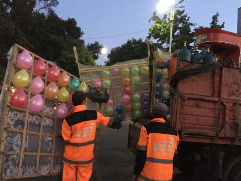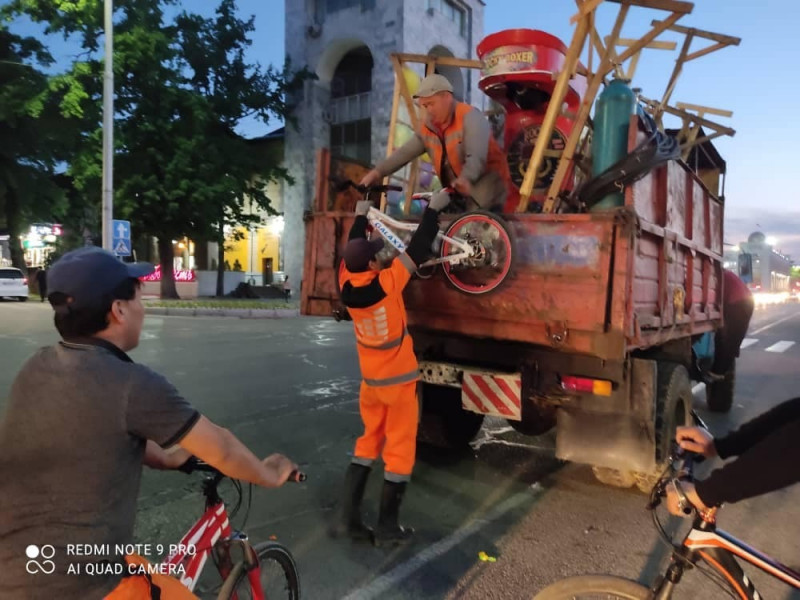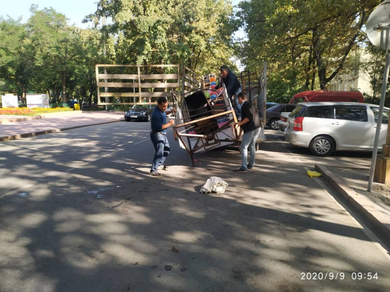 Специалистами отдела экономики и финансов Первомайского акимиата совместно с представителями управления землепользования и строительства и спецподразделения МП «Тазалык» провели очередное рейдовое мероприятие по демонтажу незаконно установленных объектов облегченного типа и игровых конструкций на центральной площади Ала-Тоо.