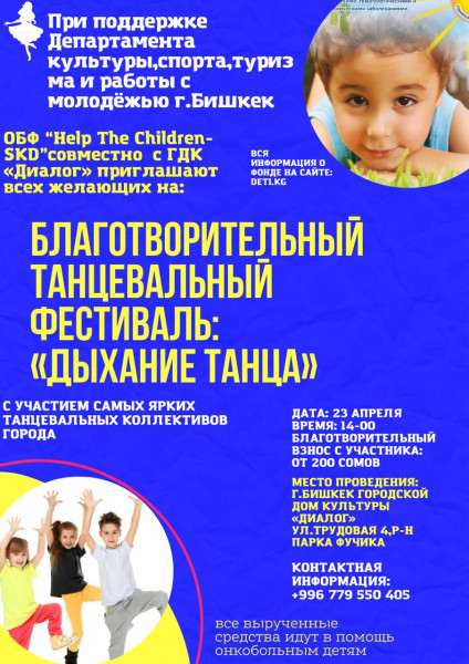 Участники танцевальных коллективов могут зарегистрироваться до 22 апреля 2022 года. Взнос за участника танцевального фестиваля: от 200 сомов и выше. Дополнительная информация по телефонам: +996 (779) 550-405, +996 (770)900-095 и на сайте: deti.кg