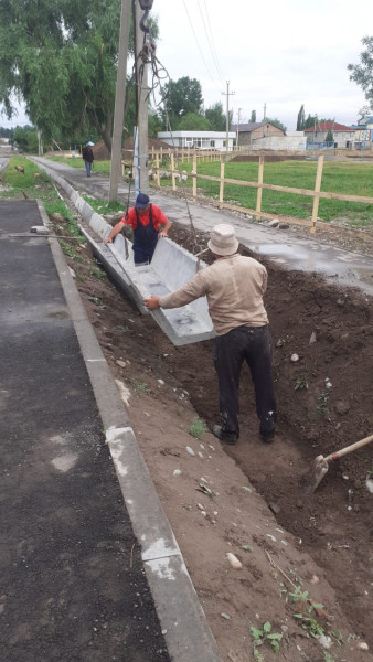 В жилом массиве «Алтын-Ордо» готовят основание под укладку тротуара и устанавливают бордюры.