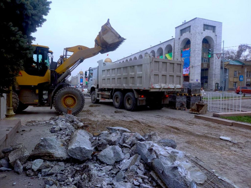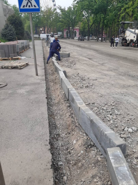 По линии МП «Тазалык» произведен демонтаж покрытия из брусчатки по пр. Чуй от ул. Панфилова до ул. Логвиненко, демонтаж бетонного фундамента ограждения здания Жогорку Кенеша Кыргызской Республики, завершены работы по укладке нового покрытия, с поправкой бордюрного камня.