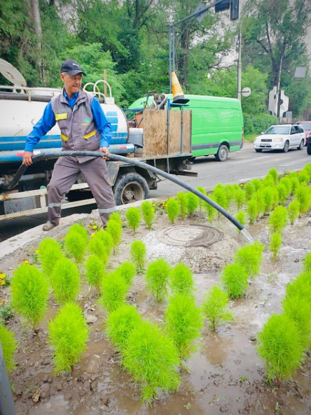 Также непрерывно ведутся работы по покосу газона и стрижке живой изгороди, на данный момент по улицам: Масалиева, Анкара, Сухэ-Батора.