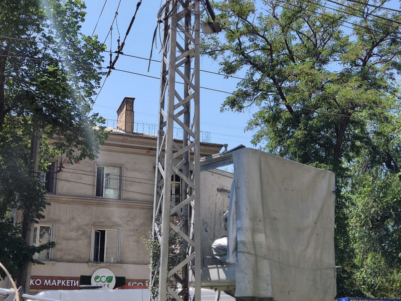 По поручению мэра столицы Эмильбека Абдыкадырова Бишкекское троллейбусное управление красит столбы.