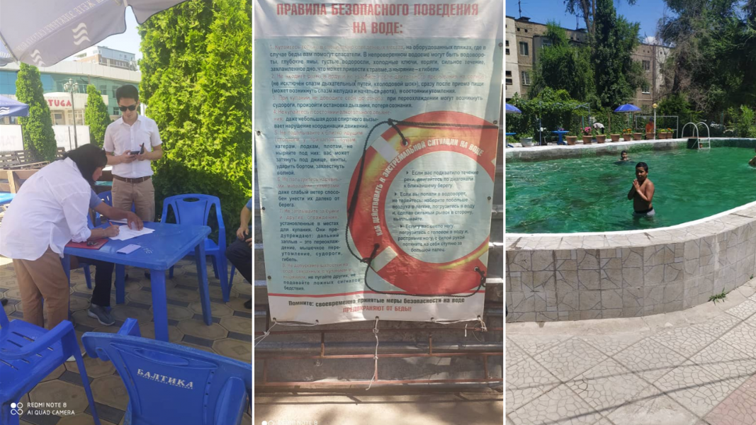 По результатам инспекции установлено, что на момент осмотра открытого бассейна «Асема» во дворе дома №86 по улице Патриса-Лумумбы находились несовершеннолетние дети без присмотра взрослых, также отсутствовали спасатели.