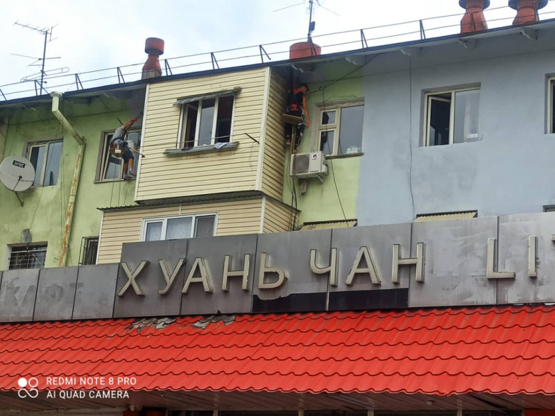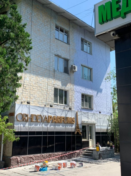 После демонтажа рекламных конструкций начата покраска здания по проспекту Чуй №128.