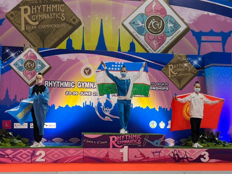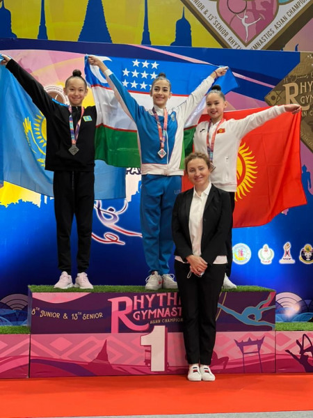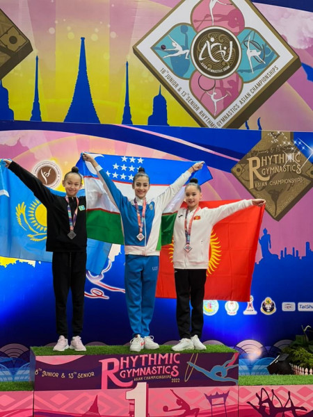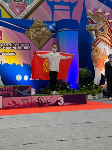 По итогам выступлений в Чемпионате Азии по художественной гимнастике среди юниоров и сеньоров национальная сборная команда Кыргызской Республики по художественной гимнастике по результатам индивидуальных упражнений в 4-х видах (обруч, мяч, булава, лента) и групповых упражнений в 2-х видах ( 5 скакалок, 5 мячей ) заняла 4 командное место.