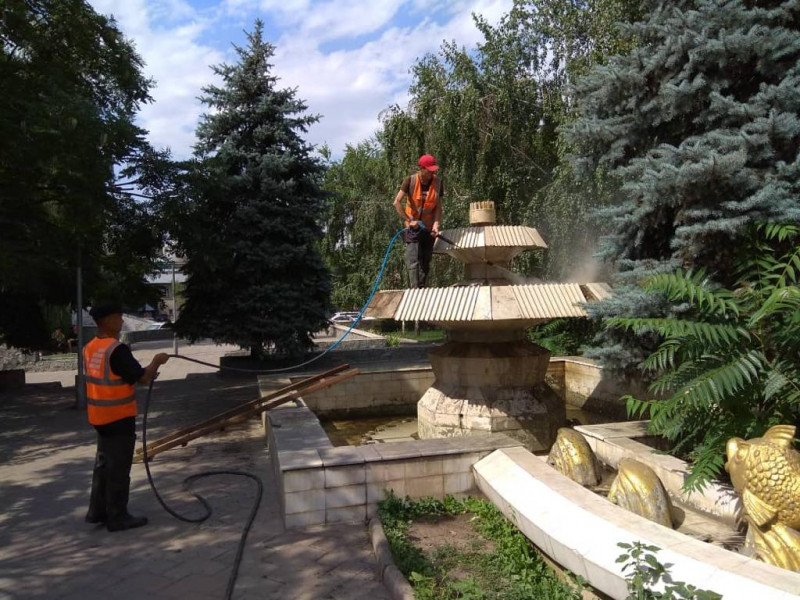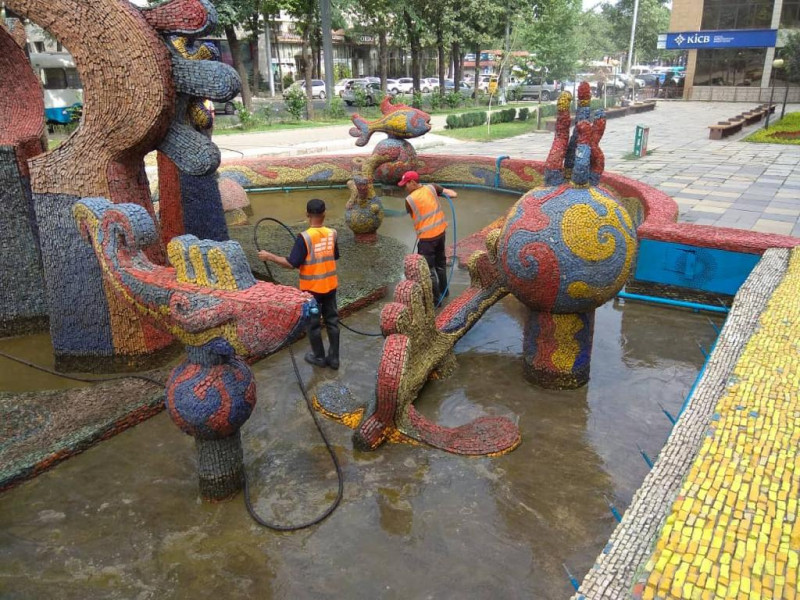 Наша бригада помыла фонтан «Солнечные рыбки», расположенный на пересечении улиц Ю. Абдрахманова и Токтогула.