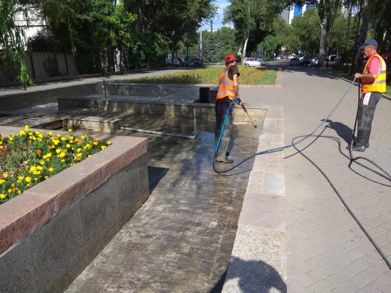 Возле Кыргызской Национальной филармонии тазалыковцы помыли южные и северные чаши фонтана.