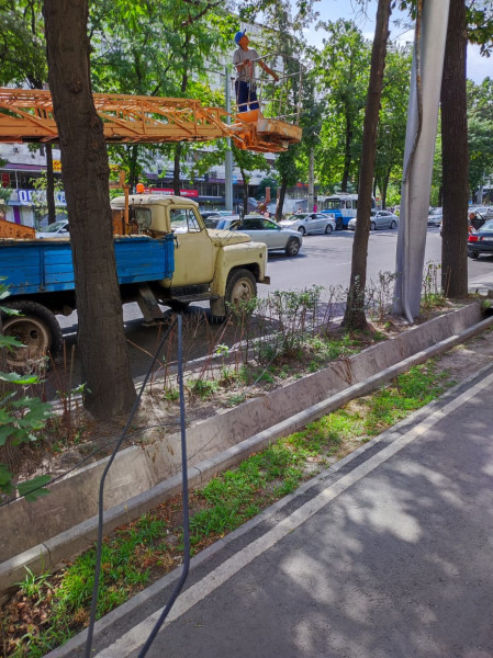 Для безопасности горожан и улучшения внешнего облика столицы продолжается обрезка проводов.