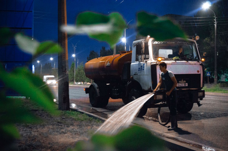 С отступлением дневного солнцепёка столичные озеленители, вооружившись шлангами, и с помощью водовозов начали полив зеленых насаждений, который длился с 18:00 до 01:00 ночи.