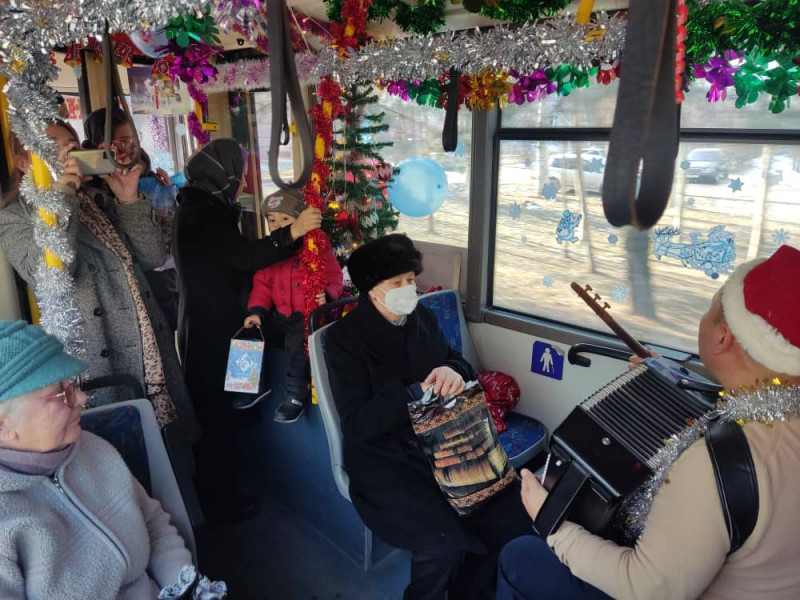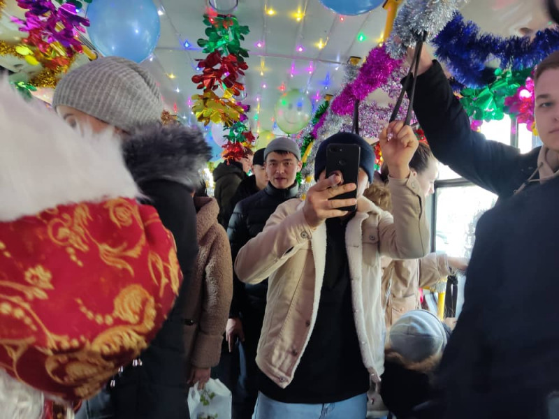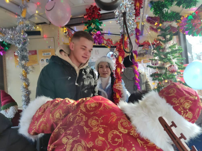 Праздночное мероприятие состоялось на 10-м маршруте. В нем приняли участие Дед Мороз, Снегурочка и артисты.