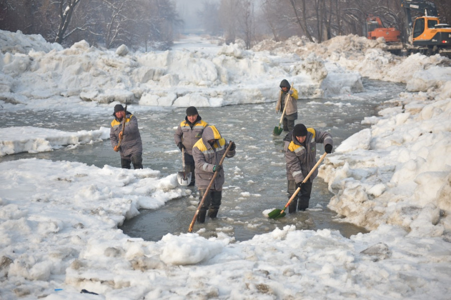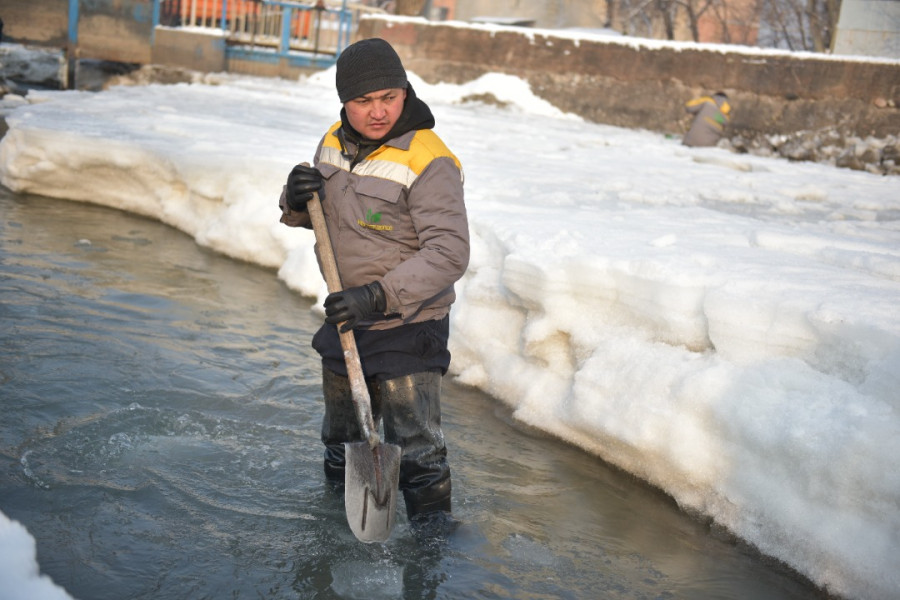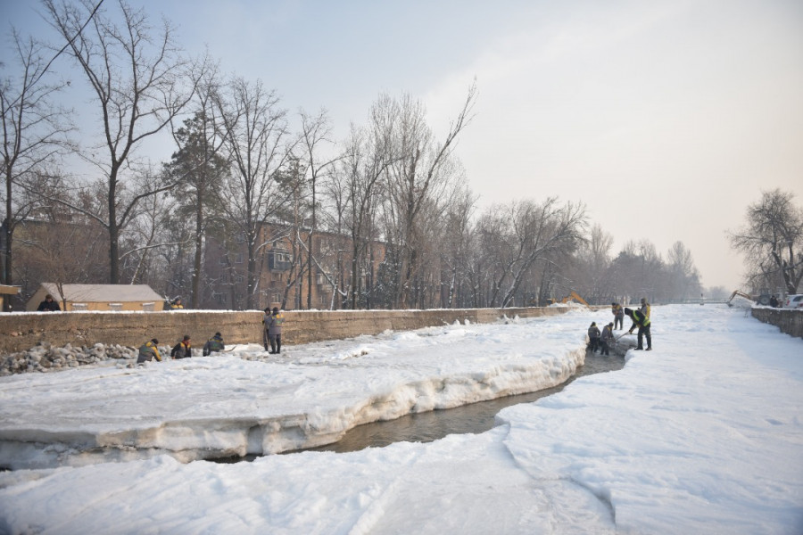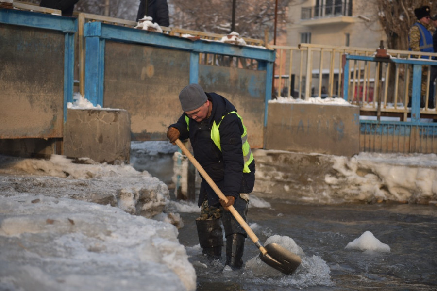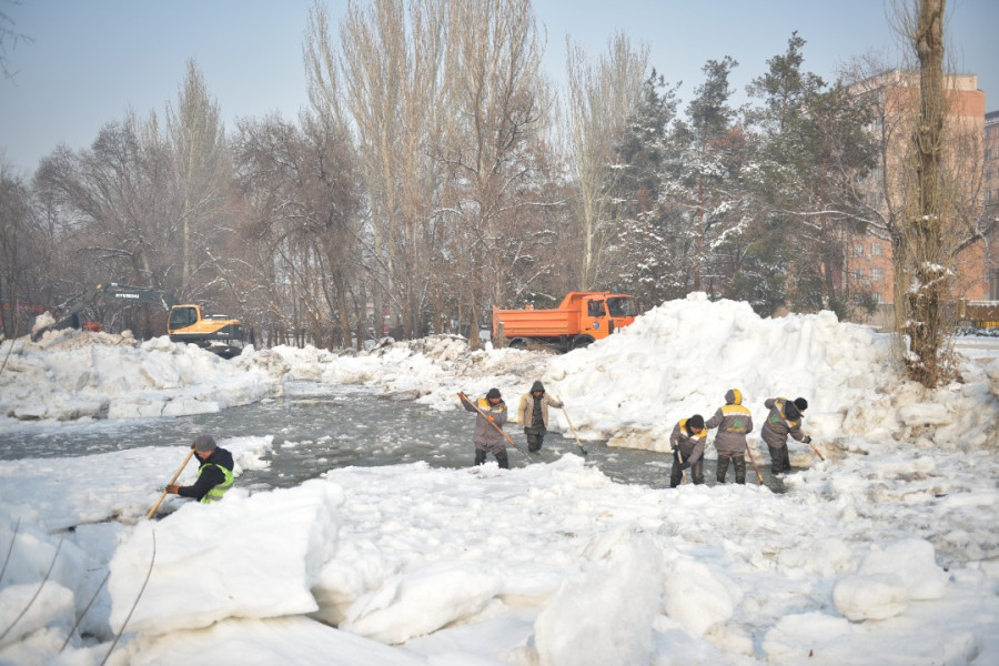 Для ликвидации затора оперативно задействовали сотрудников и спецтехнику муниципальных предприятий “Бишкекводхоз”, «Бишкекзеленхоз», ПЭУ «Бишкекводоканал» и МЧС.