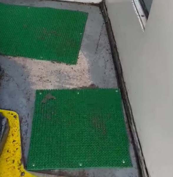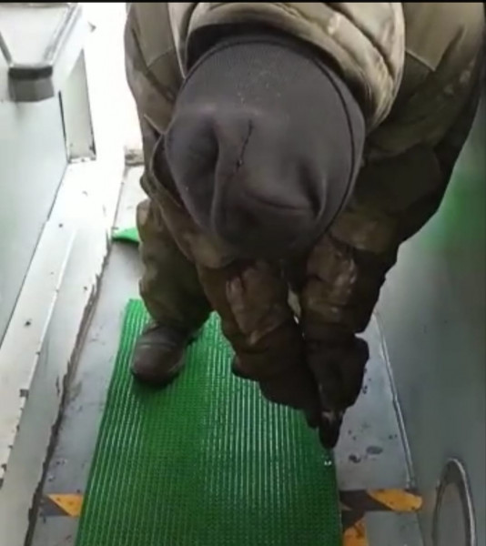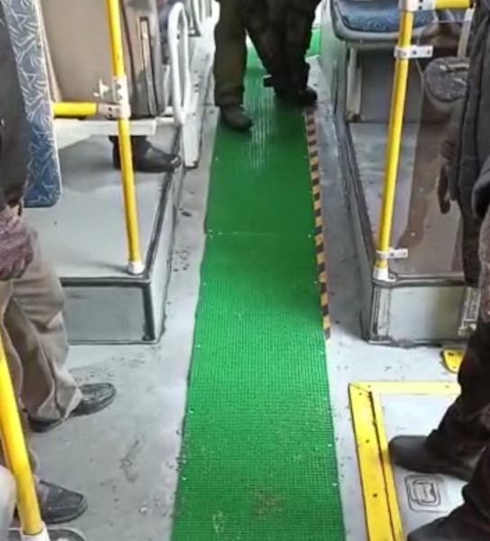 При входе в салон автотранспорта скользко и травмоопасно, для удобства пассажиров, а также по многочисленным просьбам горожан, работниками муниципального предприятия "Бишкекское троллейбусное управление" настелены нескользящие коврики.