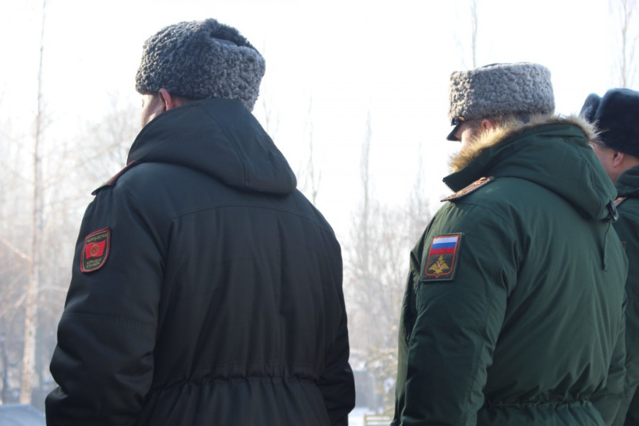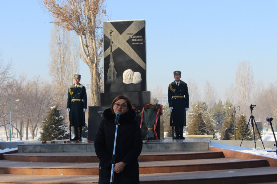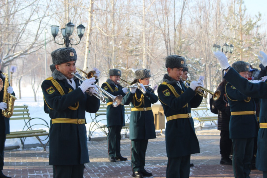 Мероприятие началось с минуты молчания и троекратного залпа и сопровождалось выступлением живого оркестра Национальной гвардии Кыргызской Республики.