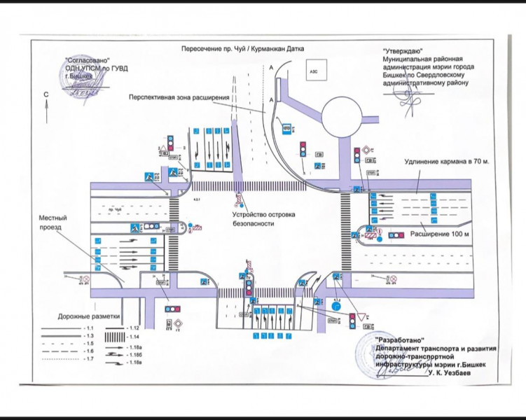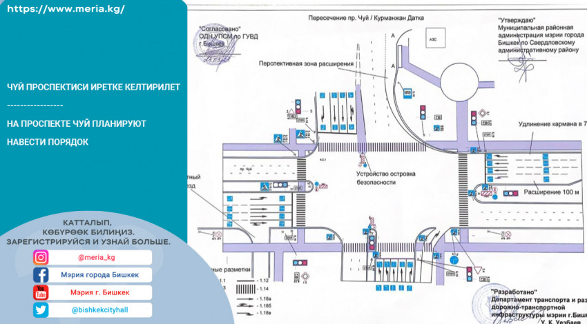 Департаментом транспорта и развития дорожно-транспортной инфраструктуры мэрии г. Бишкек разработана схема упорядочения движения автотранспортных средств по проспекту Чуй на пересечении с улицей Курманжан-Датка.