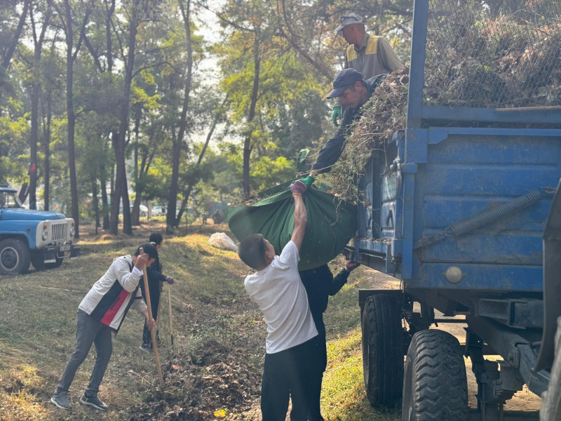 В настоящее с территории сквера вывозят ТБО, а также сухотравье, листья и ветки деревьев. Для уборки привлекли 7 единиц специальной техники муниципальных предприятий «Тазалык» и «Бишкекзеленстрой».