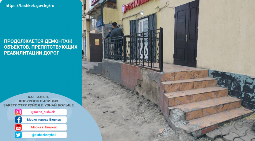 Управление по контролю за землепользованием информирует о продолжающихся работах по демонтажу объектов, препятствующих реабилитации и реконструкции дорог по улице Медерова, Горького, по проспектам Жибек-Жолу и Ч. Айтматова.