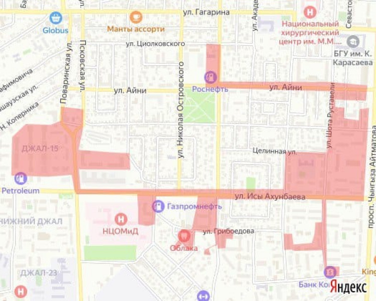 - ул. Ажыбек Баатыра – ул. А. Бакаева - ул. И. Ахунбаева - ул. Тыналиева - ул. Айни – пр. Ч. Айтматова – ул. И. Ахунбаева – ул. Ш. Руставели.