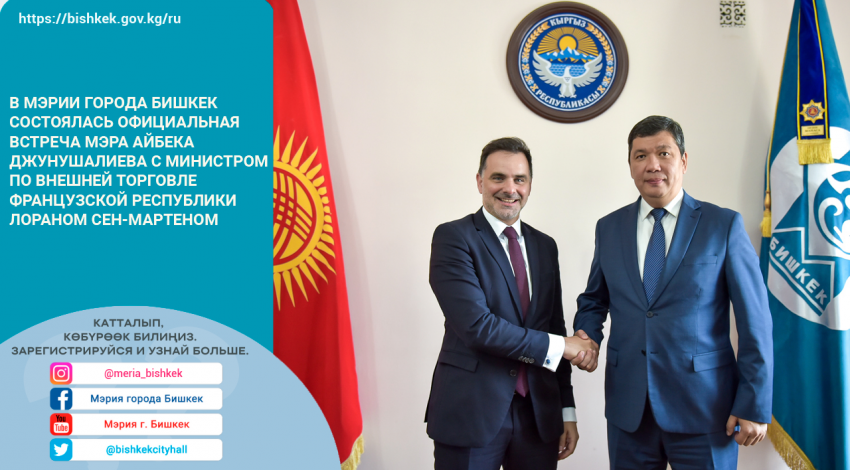 В зале заседаний мэрии города Бишкек состоялась встреча мэра Айбека Джунушалиева с Министром по вопросам внешней торговли и делам французских граждан за рубежом Франции Лораном Сен-Мартеном, сопровождаемым делегацией представителей официальных и деловых кругов Франции.