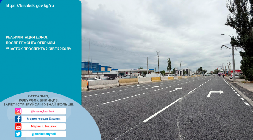 В городе Бишкек после завершения ремонтных работ с опережением графика для движения транспорта открыли участок проспекта Жибек-Жолу от улицы Буденного до улицы Курманжан Датка с северной стороны дороги.