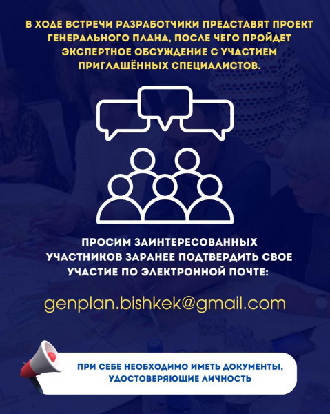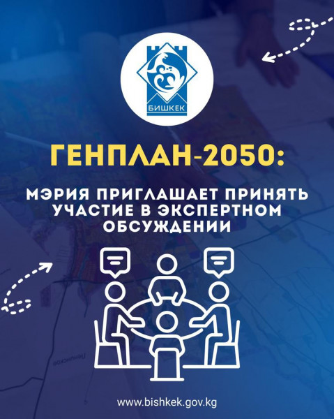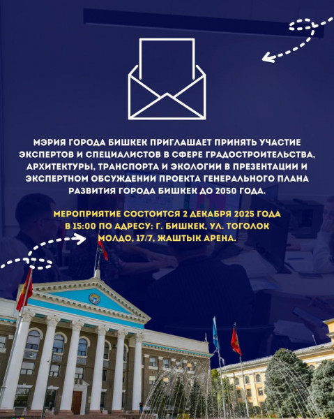 Мэрия города Бишкек приглашает принять участие экспертов и специалистов в сфере градостроительства, архитектуры, транспорта и экологии в презентации и экспертном обсуждении проекта Генерального плана развития города Бишкек до 2050 года.