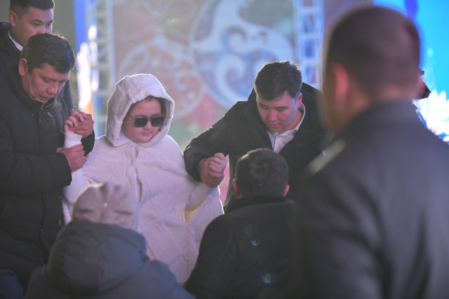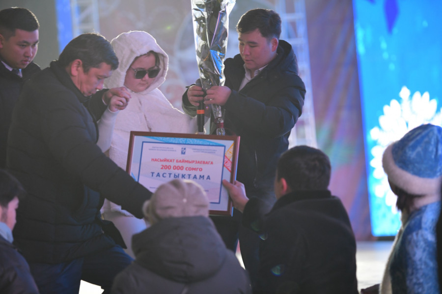 На традиционной церемонии зажжения елки мэр Айбек Джунушалиев вручил денежный сертификат из резервного фонда мэрии города Бишкек Насыйкат Байырзаевой.