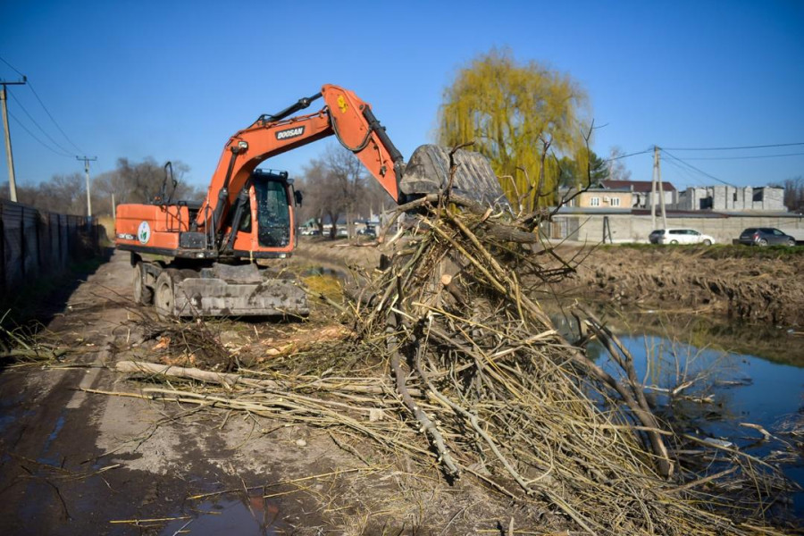 Первый этап включает очистку территории от камышей и кустарников, санитарную обрезку деревьев вдоль канала, а также демонтаж незаконных построек. Для выполнения работ задействованы более 10 единиц специализированной техники и около 30 сотрудников предприятия.