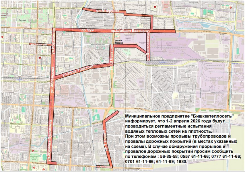 Муниципальное предприятие «Бишкектеплосеть» сообщает, что 1-2 апреля 2026 года, в городе Бишкек будут проведены регламентные испытания на плотность (опрессовка) тепловых сетей.