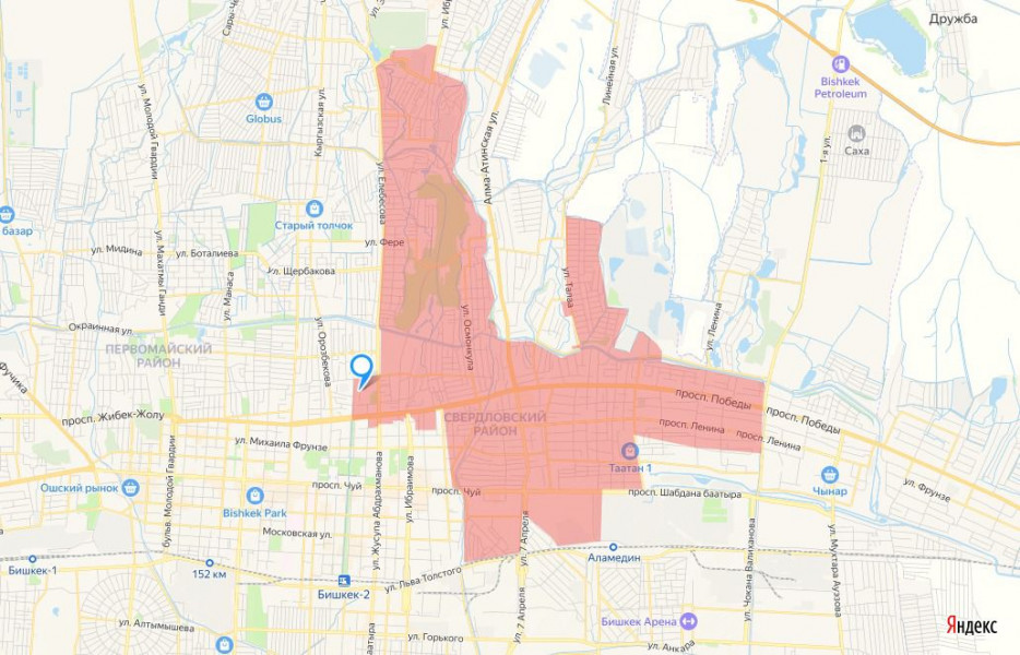 Район отключения: Лермонтова-линия железной дороги - река Аламедин - пр. Чуй - река Аламедин до пр. Жибек-Жолу, от пр. Жибек-Жолу - пер. Никитина, ул. Абдрахманова до ул. Тыныстанова, ул. Абдрахманова до Koж. завода, река Аламедин на юг до БЧК, на восток ж/м Бакай -Ата. с.Лебединовка-ул.Калинина, ул. Лермонтова до БЧК.