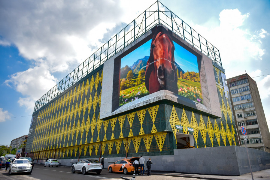 Фасад здания выполнен с применением современных перфорированных металлических панелей и дополнен светодиодным экраном, формируя современный архитектурный облик щах объекта.